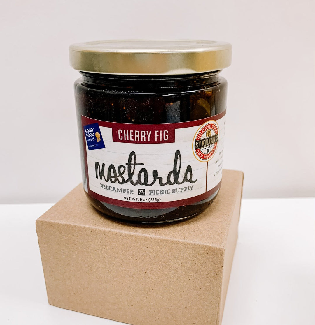 Ingredients: USA grown figs* and montmorency cherries*, Stem Ciders Real Dry cider, yellow mustard powder*, yellow and brown mustard seed*, cane sugar*, Cultura Chocolates cacao nibs, red pepper flake* and freshly ground black pepper. *ORGANIC